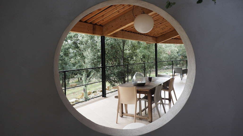 Comme un éventail, la maison se déploie dans une forêt de chênes verts, offrant au RDC 2 chambres et un grand espace de vie avec salon cuisine.