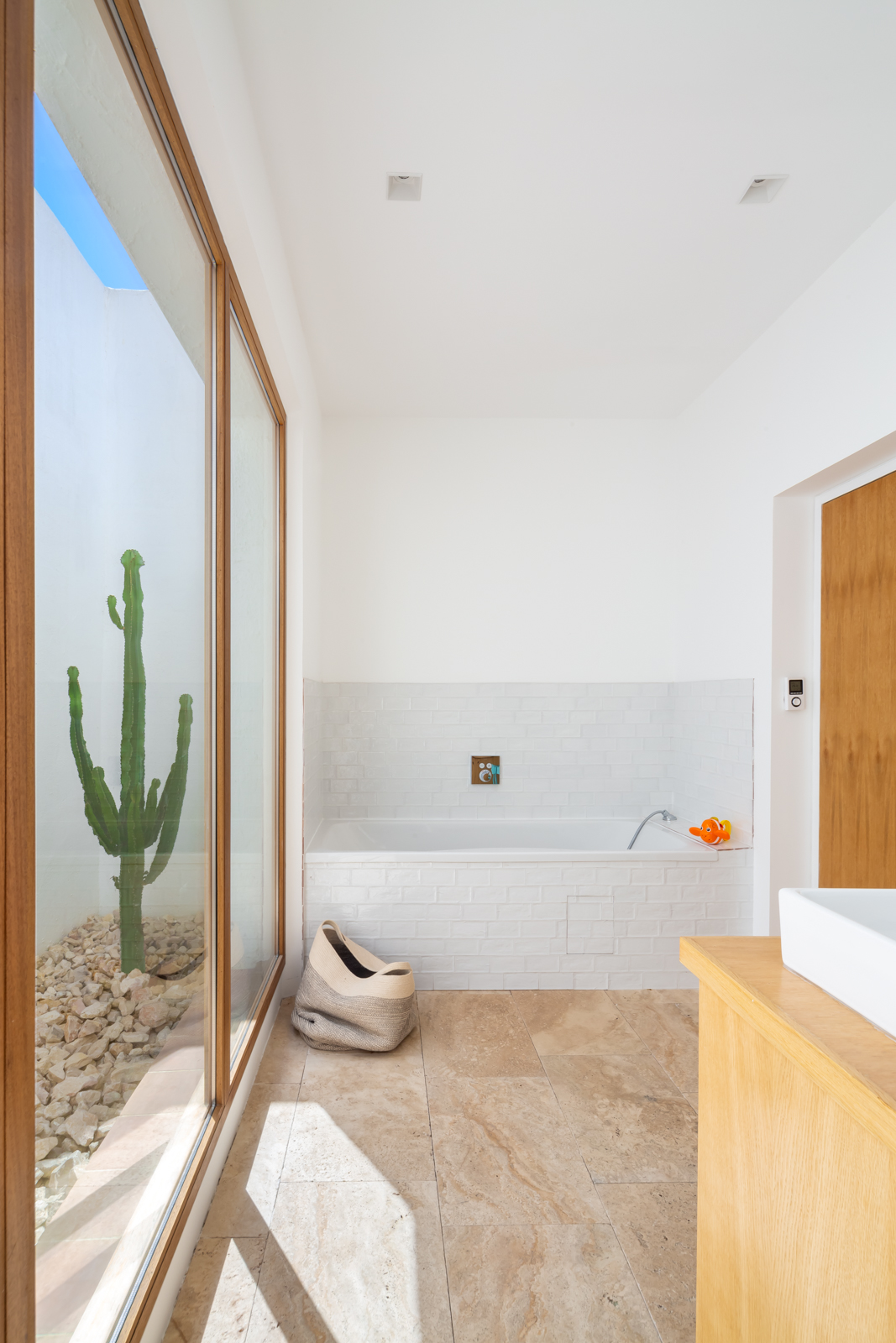 Les espaces intérieurs répondent à cette générosité lumineuse, le béton apparent au plafond, le sol en travertin et les murs captent la lumière pour nous plonger dans cette maison de bord de mer.