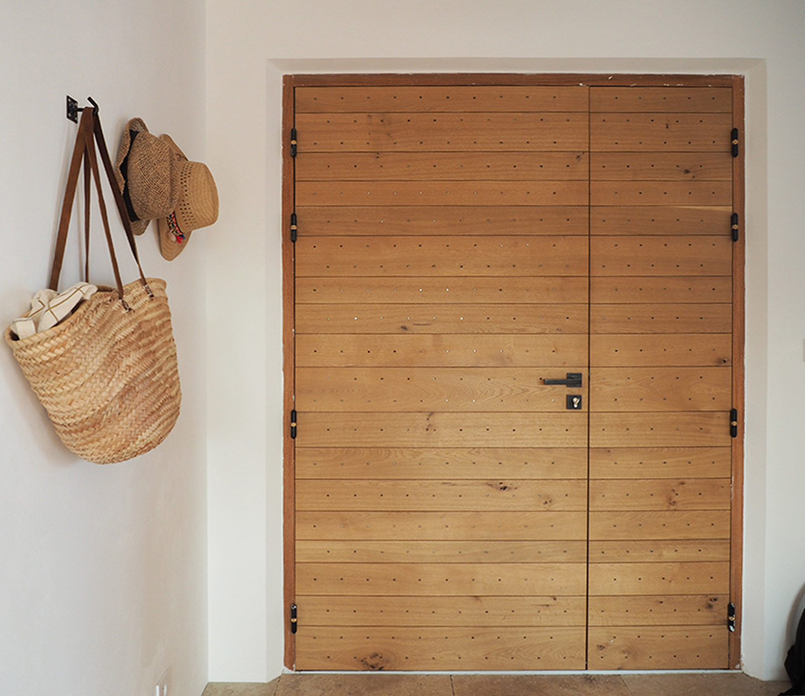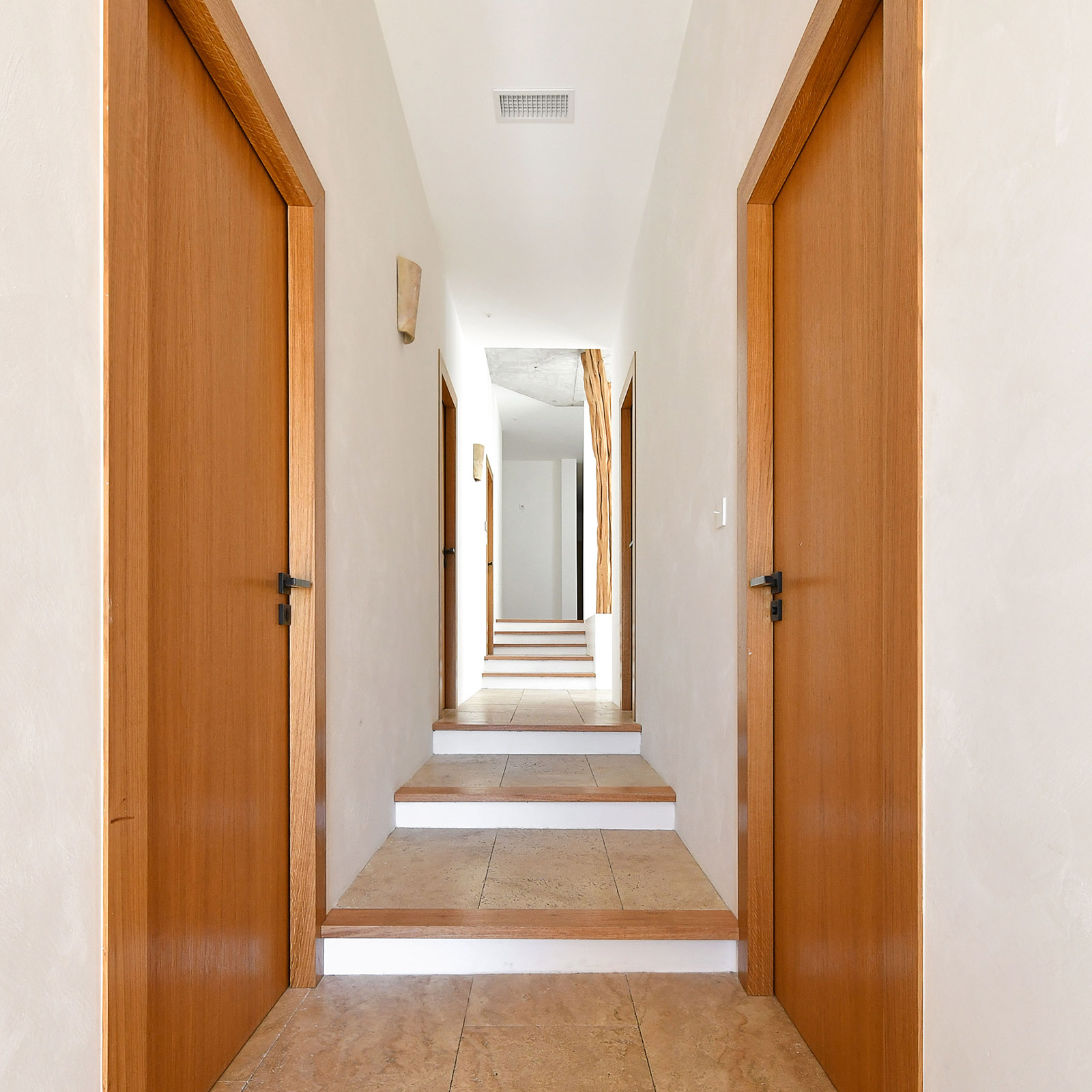 L’entrée se fait par une circulation composé de paliers successifs où escaliers et jardinières nous amènent poétiquement à l’entrée dont la porte en bois massif invite à entrer.