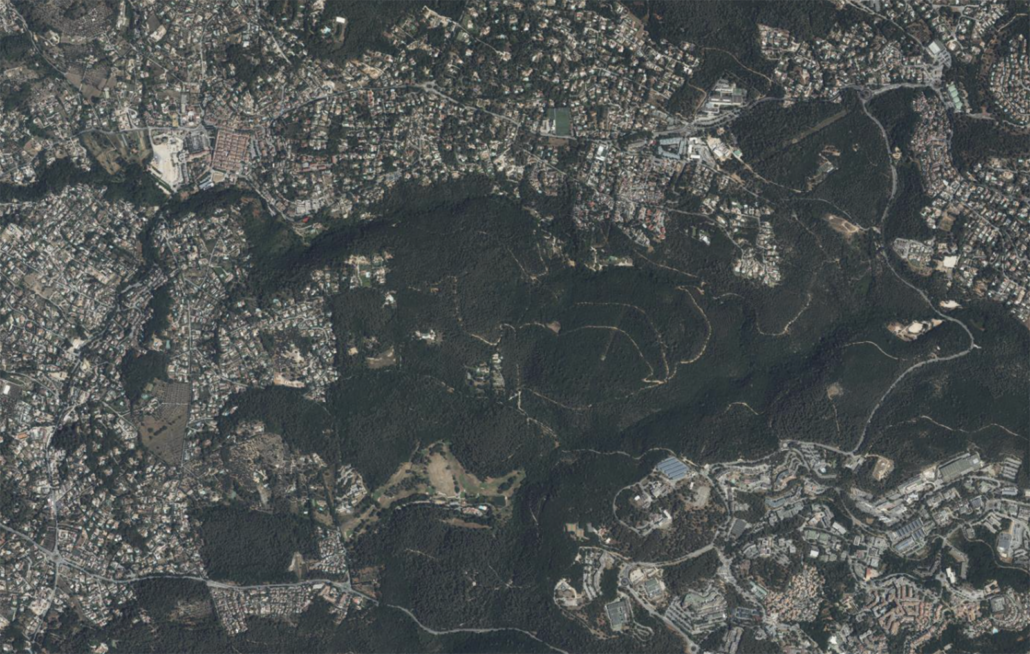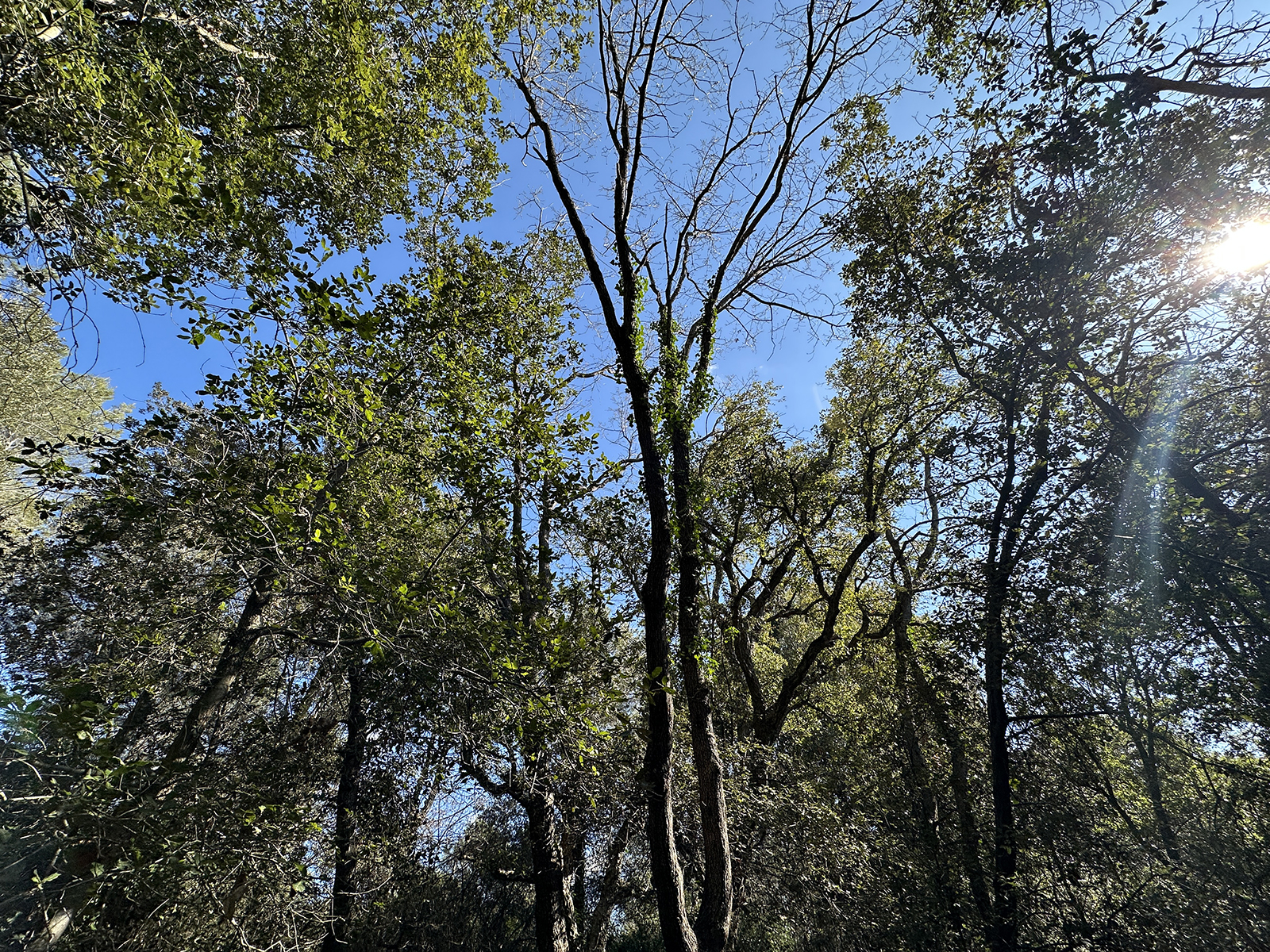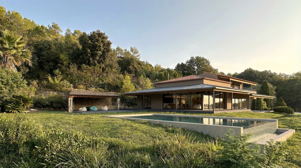 Le terrain est situé dans le sud de la France, à Valbonne, dans un environnement naturel très présent. Il est entouré d’arbres variés, notamment des sapins et d’autres essences qui densifient le paysage et créent une véritable immersion végétale.