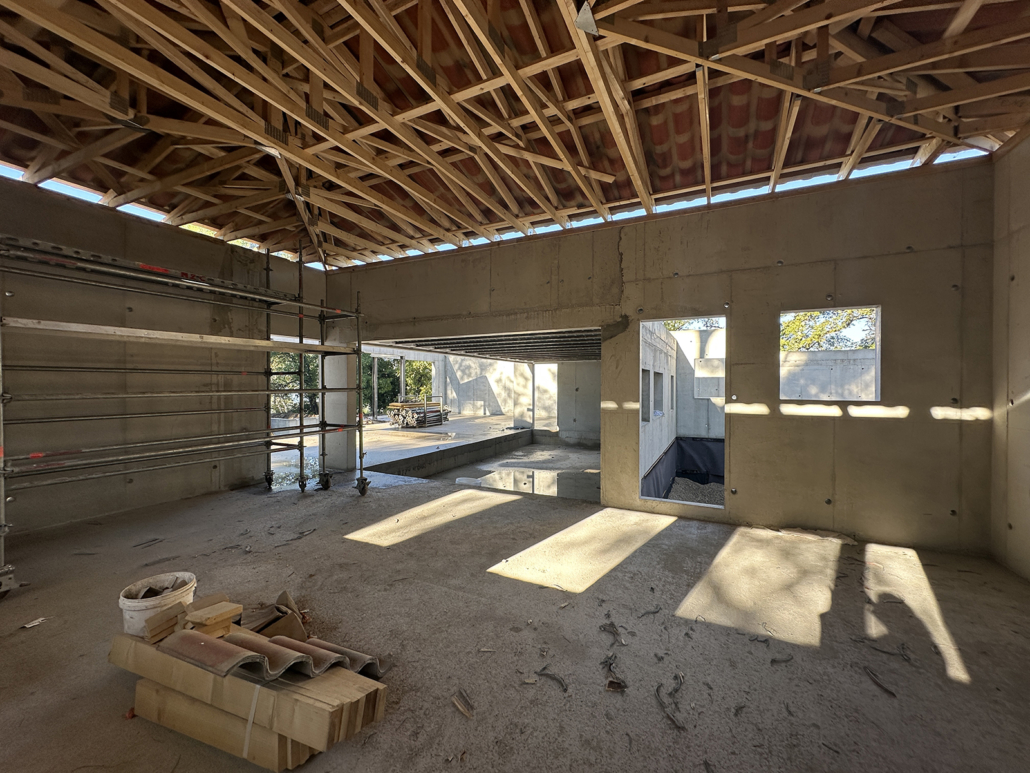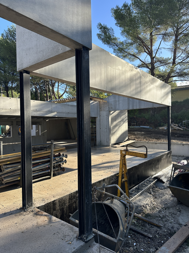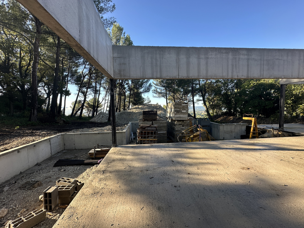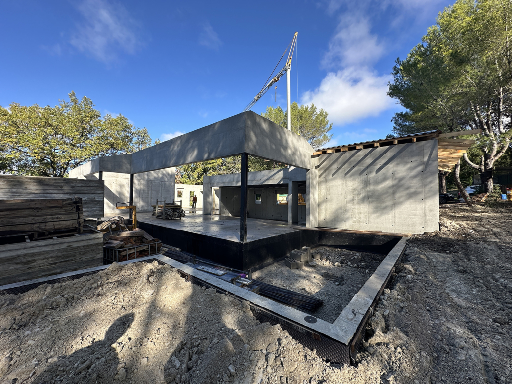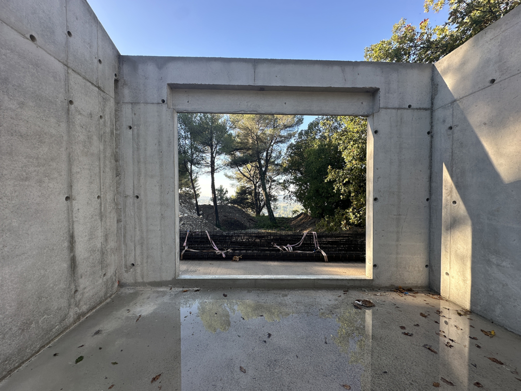 Située à Aix-en-Provence, cette maison construite en béton Banché, avec ses grandes toitures en tuiles s’organise autour d’un patio et donne également sur une forêt boisée grâce à de grandes baies vitrées protégées du soleil par des débords de toiture.